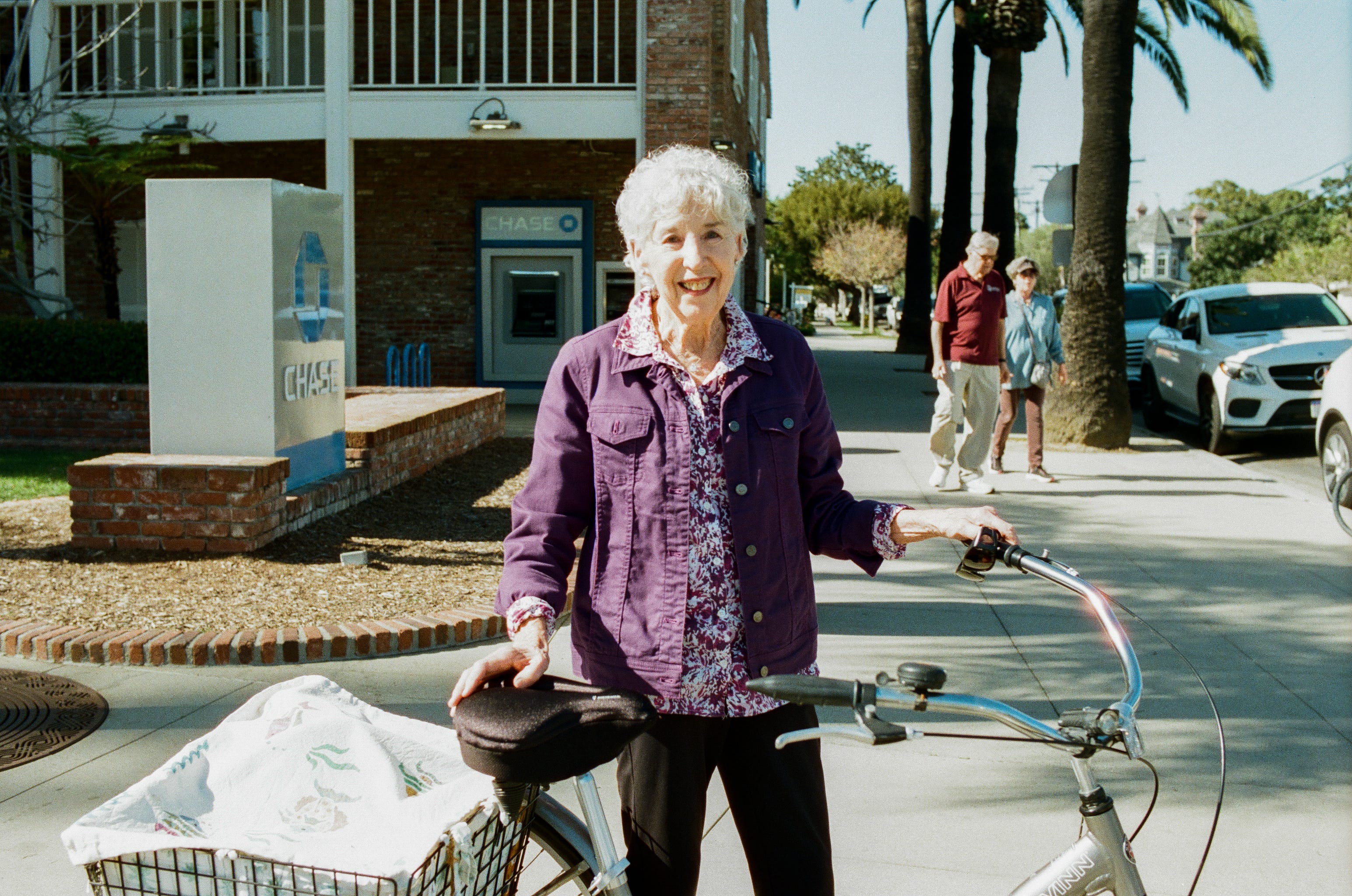 I was on Coronado Island in San Diego walking around town trying to figure out the mechanics of opening my mouth when an older woman with this big three wheeled bike approached me at a crosswalk and asked, “Excuse me, did you push the button?” I looked up and saw this wonderfully stylish woman with a big personality, a big bike, and purple in her hair (which unfortunately doesn’t show up in the photo.) I said I loved her style and asked if she would mind if I took her photo. She said, “Not at all!” I found out she was a military wife and her and her husband traveled the world during his service and settled on Coronado. She hadn’t driven in years and was on her second bike like that. The bike fit her very well.